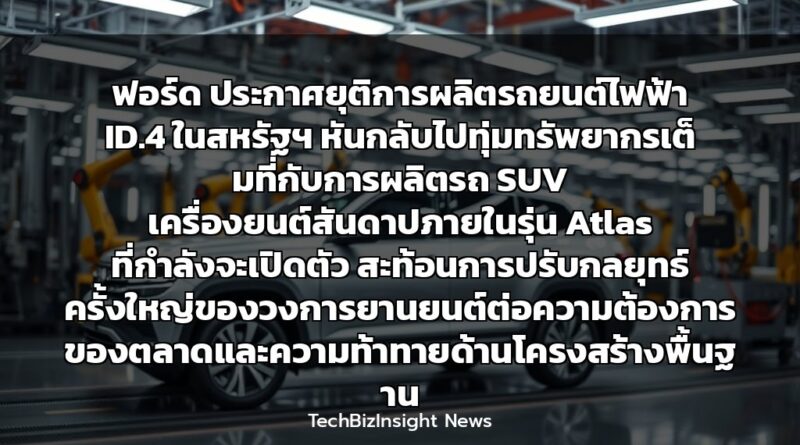 ฟอร์ด ประกาศยุติการผลิตรถยนต์ไฟฟ้า ID.4 ในสหรัฐฯ หันกลับไปทุ่มทรัพยากรเต็มที่กับการผลิตรถ SUV เครื่องยนต์สันดาปภายในรุ่น Atlas ที่กำลังจะเปิดตัว สะท้อนการปรับกลยุทธ์ครั้งใหญ่ของวงการยานยนต์ต่อความต้องการของตลาดและความท้าทายด้านโครงสร้างพื้นฐาน